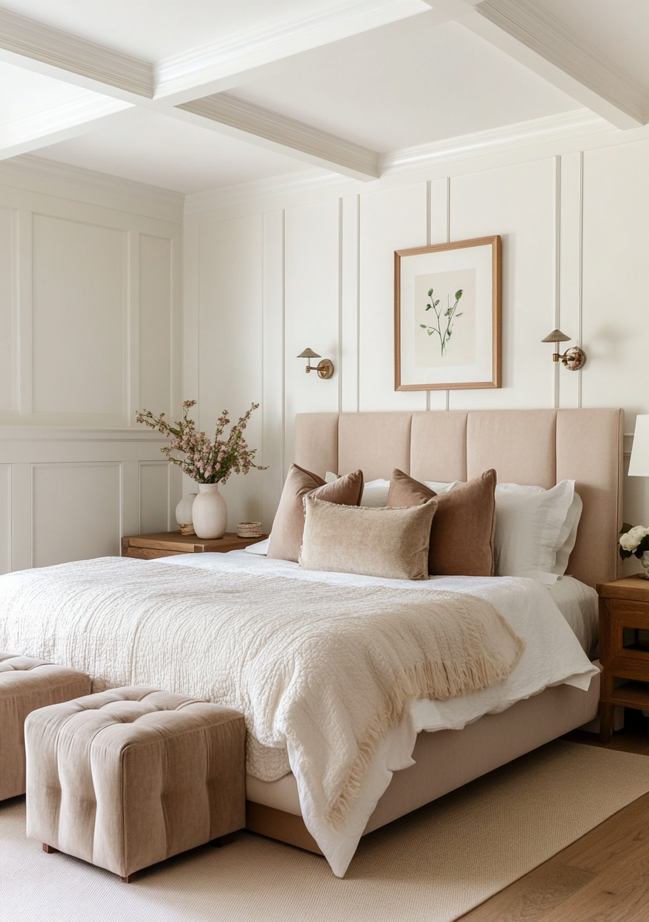 Paint it one color (including trim) for a seamless look, then bring in contrast through bedding and lighting. If you want it extra calm, keep your grid lines subtle (thin battens, minimal depth). The end result feels architectural, not fussy.